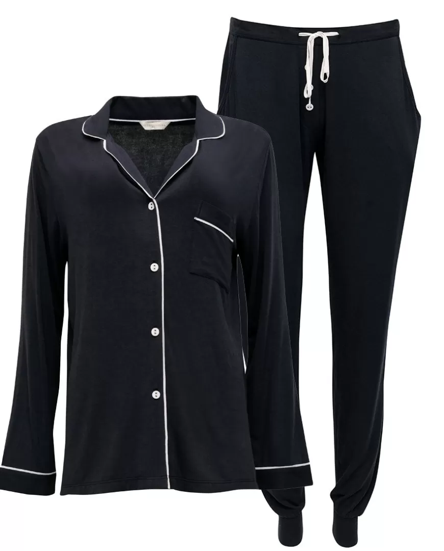 Immerse Yourself In Unparalleled Comfort With Our Charcoal Revere Knit Pyjama Set. Experience The Exquisitely Soft Blend Of 95% Modal And 5% Elastane As You Slip Into The Luxurious Charcoal Revere Pyjama Top. The Addition Of Elegant White Modal Trim Adds A Touch Of Sophistication, Elevating This Top To New Levels Of Opulence. With Its Timeless Charm, The Revere Collar Design Exudes A Refined And Polished Look. Appreciate The Practicality Of The Single Pocket, While The Front Fastening With White Modal Covered Buttons Adds An Element Of Elegance And Ease. Revel In The Sumptuousness Of The Fabric Against Your Skin And Admire The Meticulous Craftsmanship Of The Pyjama Top. Complete Your Ensemble With The Matching Charcoal Knit Pyjama Bottoms. Crafted With The Same Exquisitely Soft Modal And Elastane Blend, These Pyjama Bottoms Offer Unmatched Comfort. The White Modal Trim Adds A Touch Of Sophistication, While The Elasticated Back And Working Drawstring At The Front Allow For A Customised Fit. With Two Side Pockets And Ankle Cuffs, These Pyjama Bottoms Combine Practicality And A Snug, Cosy Feel.