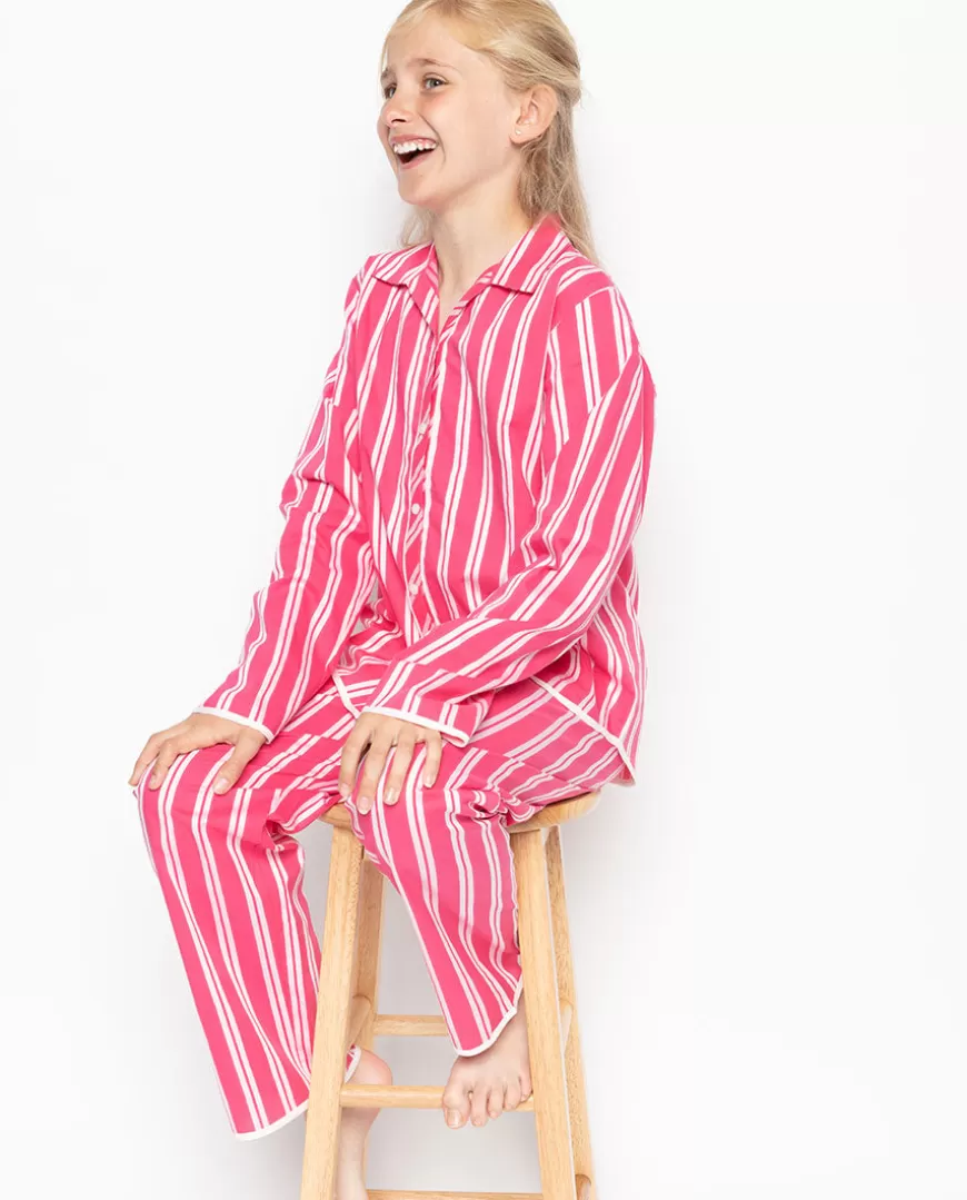Candy Stripes In Cool Cotton Give Our Mallory Pyjama Set A Little Fun And A Timeless Appeal. Made From 100% Super Soft Cotton, The Set Is Trimmed With White Modal. The Long-Sleeved Top Has An Open Collar And Fastens At The Front With White Buttons. Fully Elasticated At The Waist With An Adjustable Front Drawstring, The Trousers Have A Comfy, Flattering Fit. It’S Easy To Create Mini-Me Looks With Our Mallory Range As Coordinating Styles Are Also Available In Our Women’S Collection.
